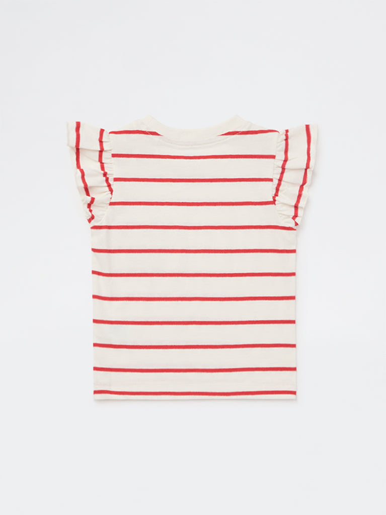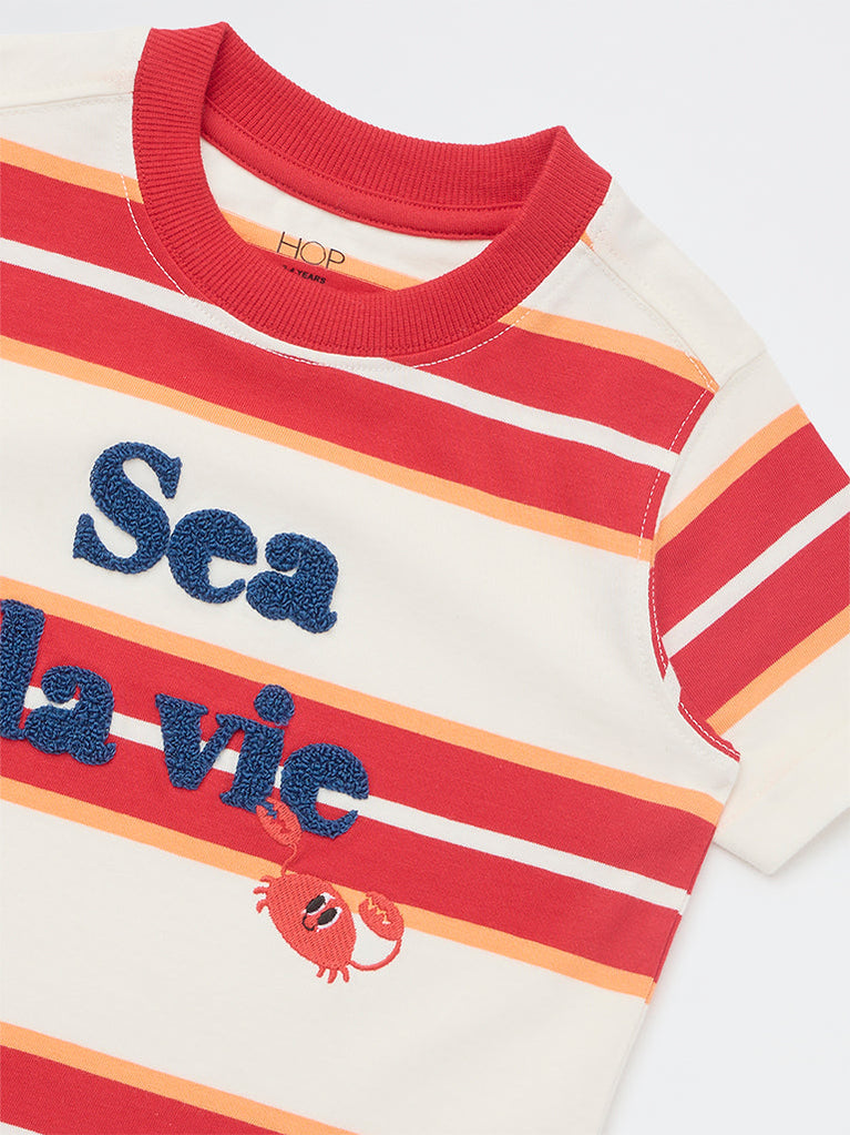 Bring seaside-inspired fun to everyday wear with this red striped t-shirt from HOP Kids. Crafted from soft cotton, it features bold horizontal stripes paired with a playful slogan and tiny crab motif. The classic crew neckline and short sleeves ensure easy comfort for active days.