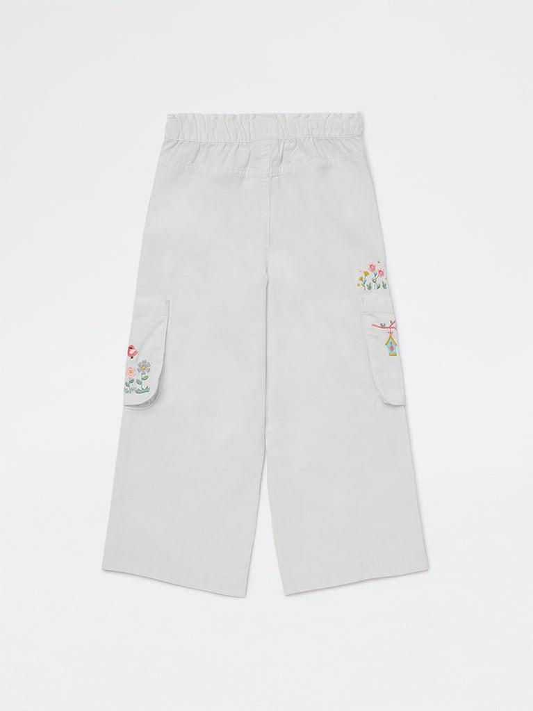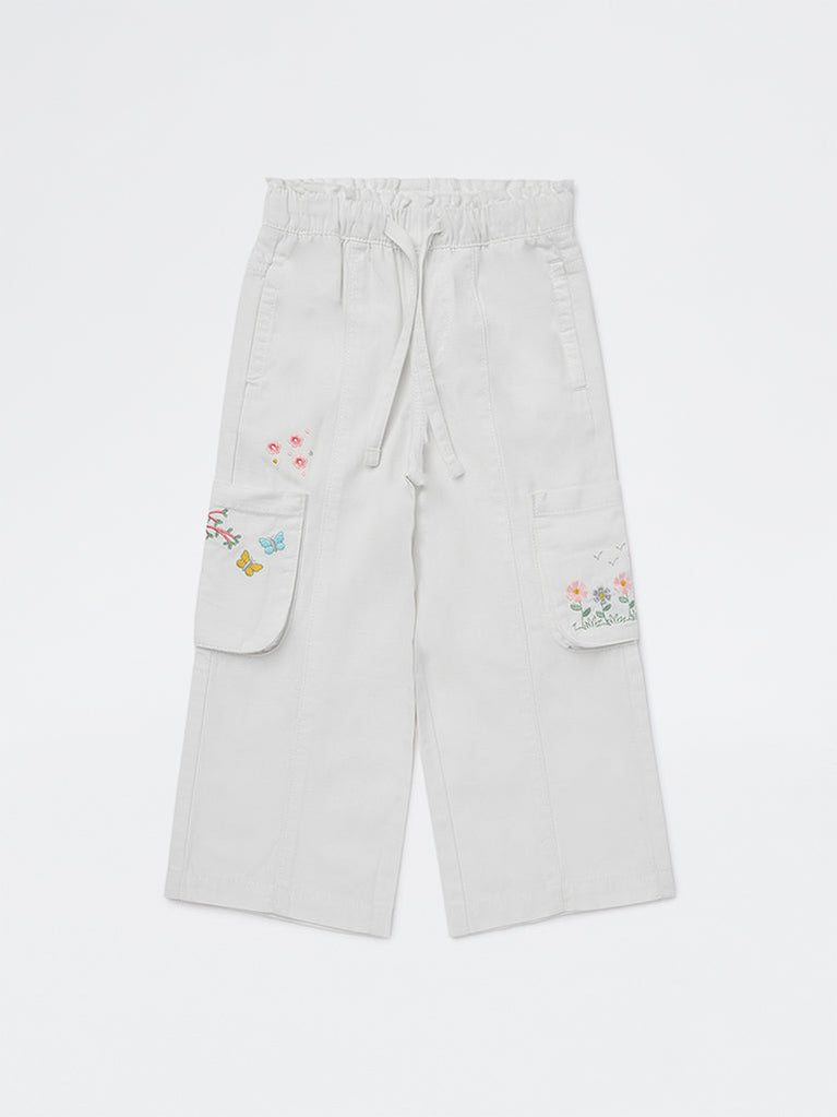 HOP Kids Girls White Embroidered High-Rise Cotton Cargo Pants