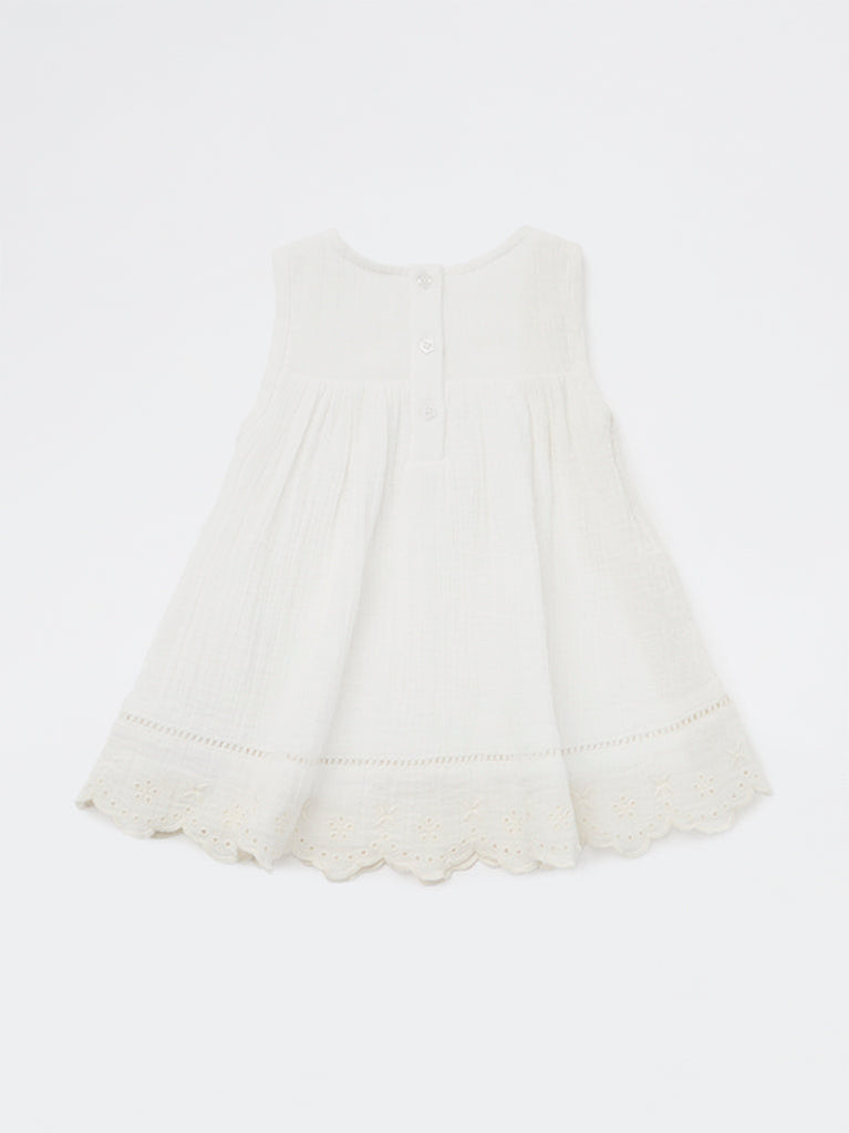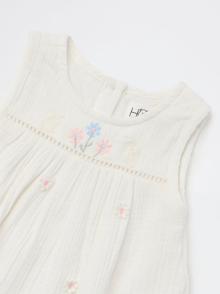 Choose everyday elegance with this white dress from HOP Baby, detailed with floral embroidery at the front. Spun from pure cotton with a soft crinkle texture, it allows easy movement and breathability. The sleeveless cut keeps it airy, while the back button placket makes dressing fuss-free.