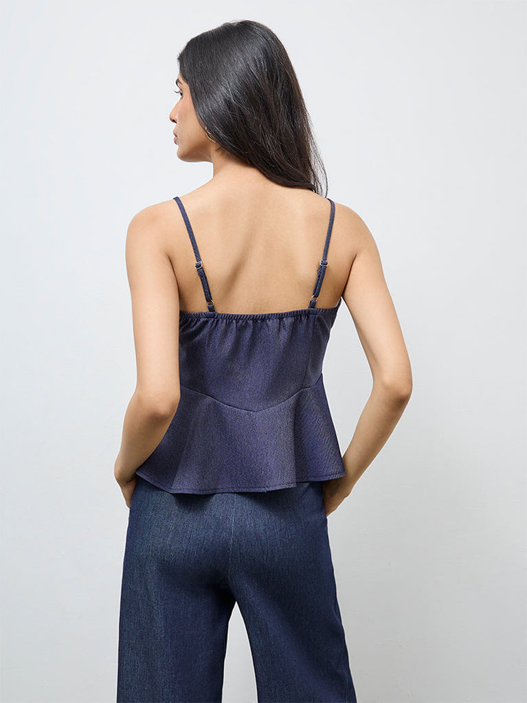 Made for days when you want structure without effort, this dark blue denim top from LOV is shaped in a flattering peplum silhouette. The breathable fabric keeps it comfortable, while the plunging V-neck and adjustable shoulder straps add a modern edge.