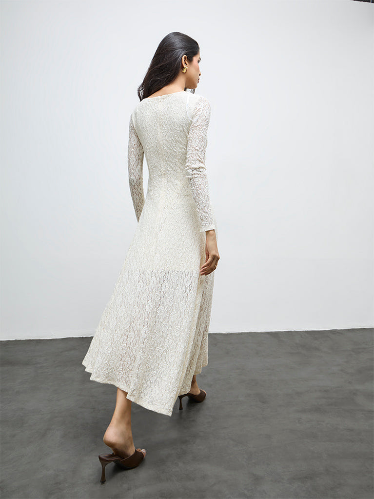 Upgrade your occasion wardrobe with this cream dress from LOV, crafted in a luxurious lace fabric that feels refined yet effortless. The round neckline and full sleeves create a balanced silhouette, while the matching lining ensures comfortable coverage.