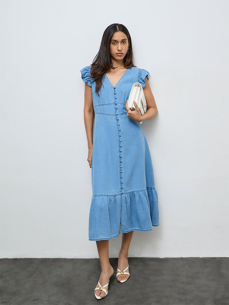 Embrace effortless femininity with this blue dress from LOV, crafted from structured denim in a fluid A-line silhouette. Framed by a flattering V-neck and finished with delicate flutter sleeves, it strikes a balance between casual charm and elevated simplicity.