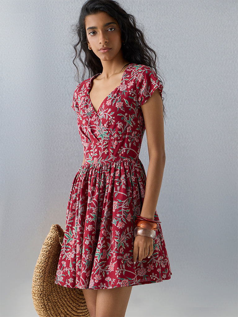 This red dress from Bombay Paisley features bold botanical prints for a striking appeal. It is styled with a V-neck, a sleeveless profile and functional side pockets. Woven from cotton-rich fabric, it’s a breezy pick for day brunches and casual get-togethers.