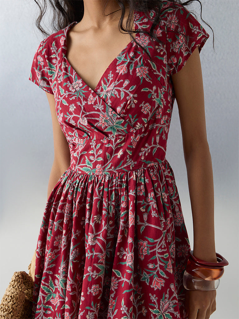 Make a statement with this red dress from Bombay Paisley. Featuring delicate floral prints, it is crafted with soft pleats that lend a flowing, graceful movement. Designed with a pentagon neckline, short sleeves, and handy side pockets, the dress is elevated by a cut-out back with smocked detailing, blending style and comfort for everyday wear.