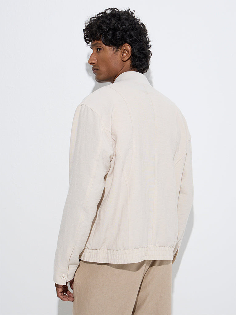 Cut in a relaxed silhouette, this beige bomber jacket from Ascot is made from a linen-blend fabric for a lightweight feel. Designed with a mock collar, full sleeves, and a zipper placket, it’s the perfect layer for transitional weather. Two flap pockets add a functional touch to this stylish piece.