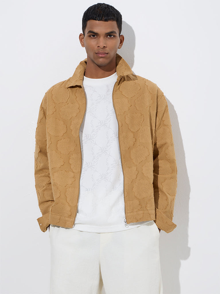 This mustard jacket from ETA flaunts floral patterns that bring a modern edge to its relaxed silhouette. Spun from pure cotton for elevated comfort, it is styled with a semi-spread collar, a zipper placket, and full sleeves. Whether layered over basics or paired with coordinated separates, this piece adds statement flair to your weekend contingent.
