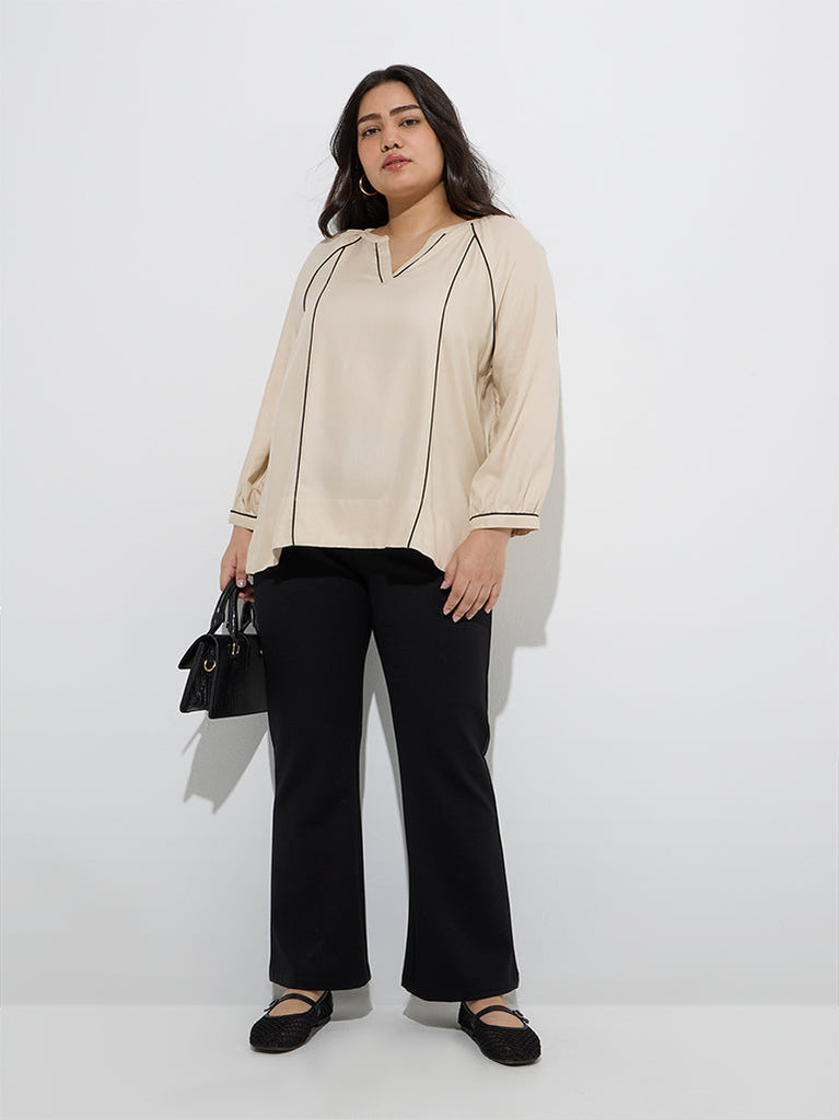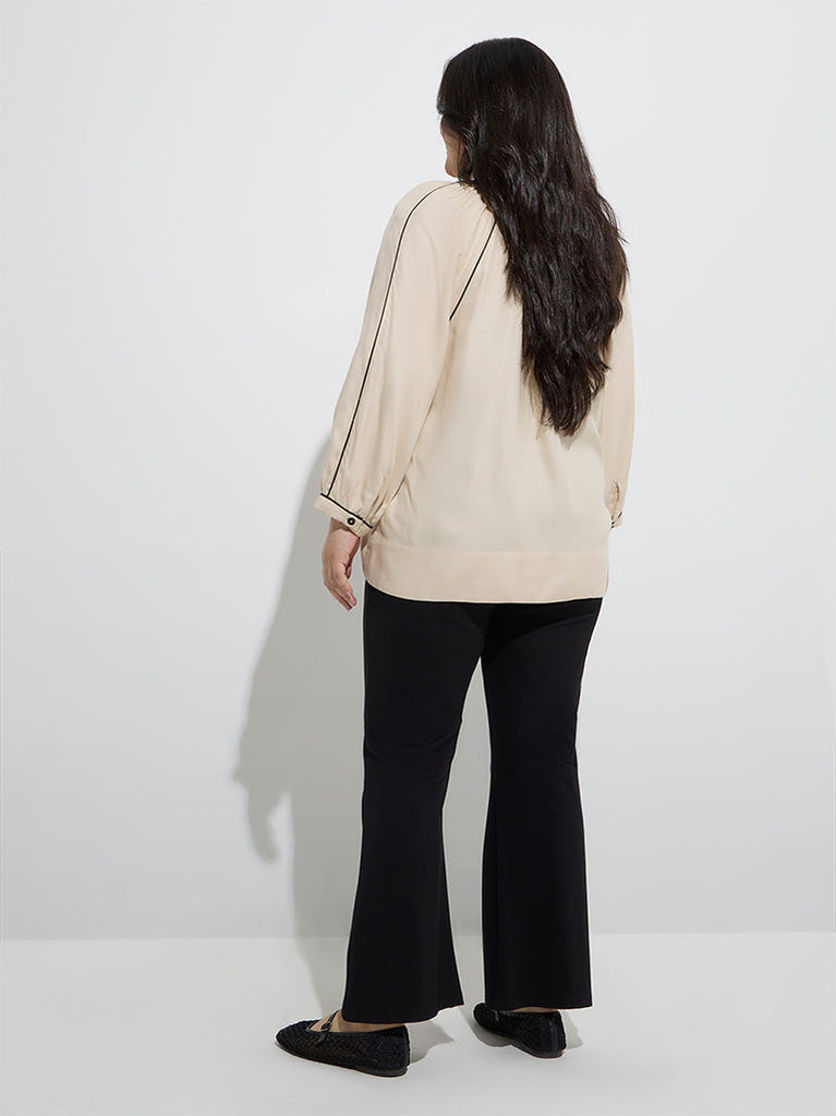 This beige top from Gia is detailed with contrast piping for a touch of definition. Constructed from a lightweight fabric, it features a split neck and raglan sleeves that lend ease and elegance.