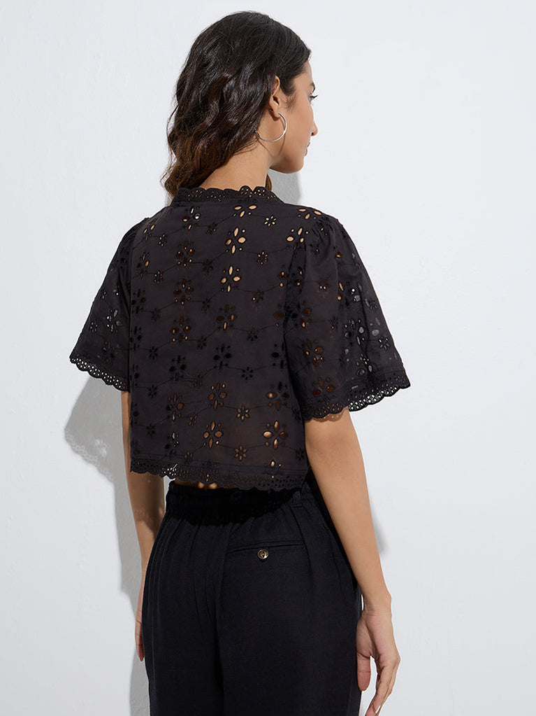 Bombay Paisley Black Schiffli-Detailed Cotton Top