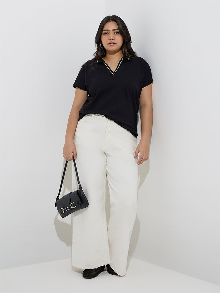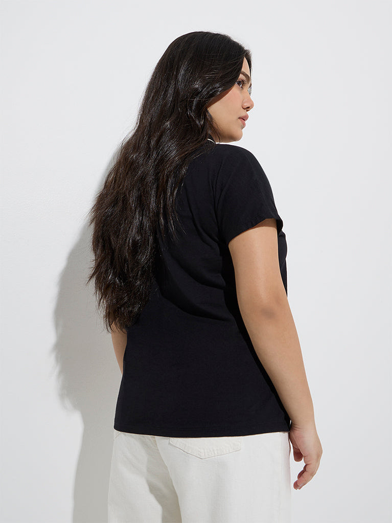 This black top from Bombay Paisley highlights schiffli embroidery for an elegant look. Crafted from pure cotton for daily comfort, the V-neck is framed with a scalloped edge and finished with a delicate tie-up detail at the front, while half sleeves lend a breezy and feminine touch.