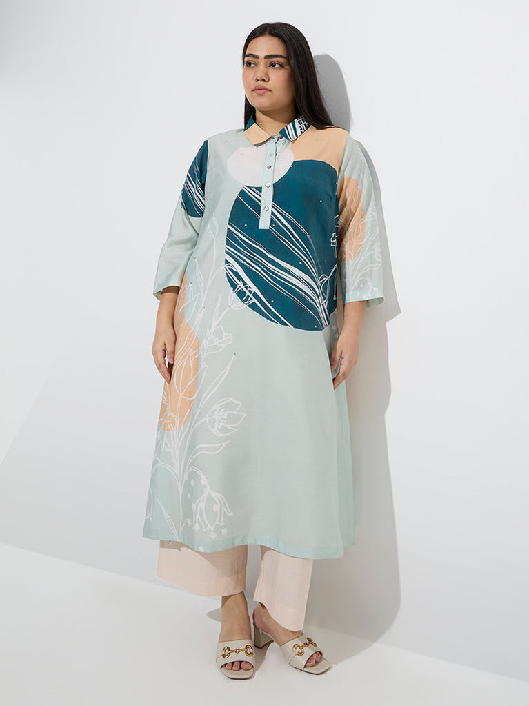This multicolour kurta from Diza blends floral prints with geometric motifs, creating a striking and distinctive visual appeal. Woven from a lightweight fabric in an A-Line frame, it features a crisp collar, a quarter button placket, and three-quarter sleeves for effortless style. A discreet slip pocket adds practical utility.