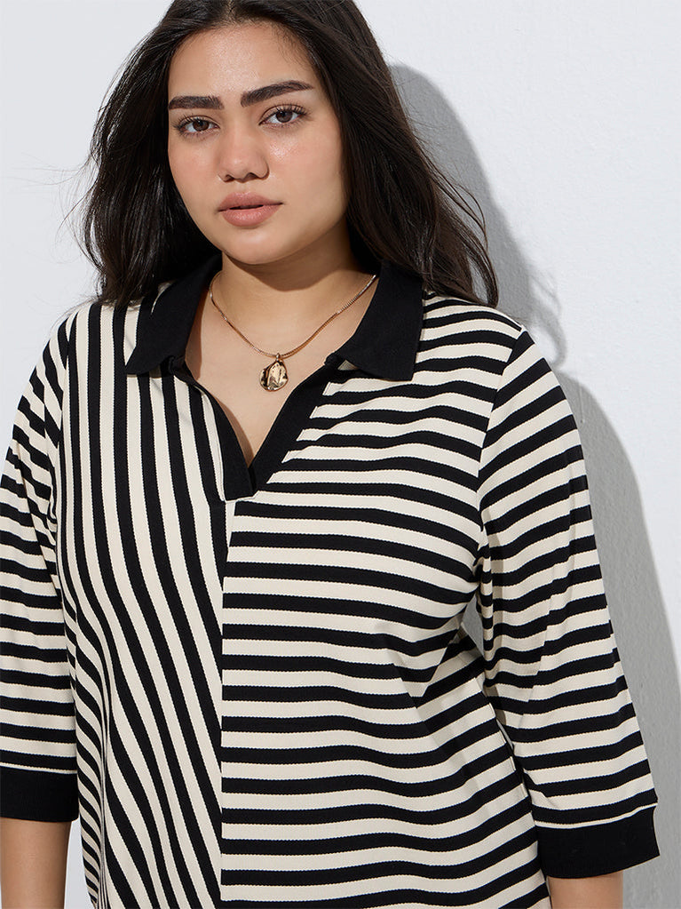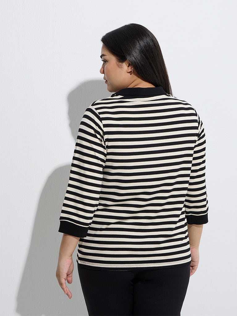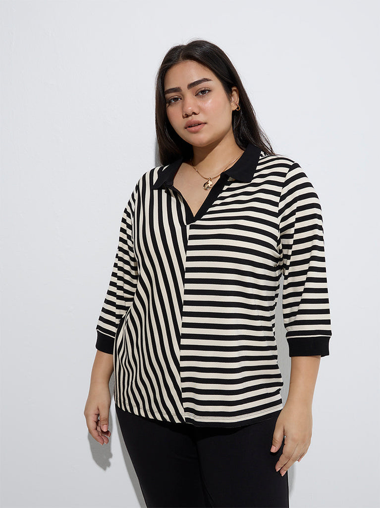 This black t-shirt by Gia is defined with stripe prints and features a V-neck collar with three-quarter sleeves. Spun from a breathable fabric, it’s a comfortable choice that effortlessly fits into your casual wardrobe.