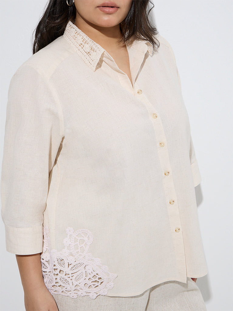 This beige shirt from Gia is spun from pure cotton and flaunts intricate lace detailing on the collar and sides. Styled with three-quarter sleeves and a button placket, it blends classic design with subtle feminine touches.