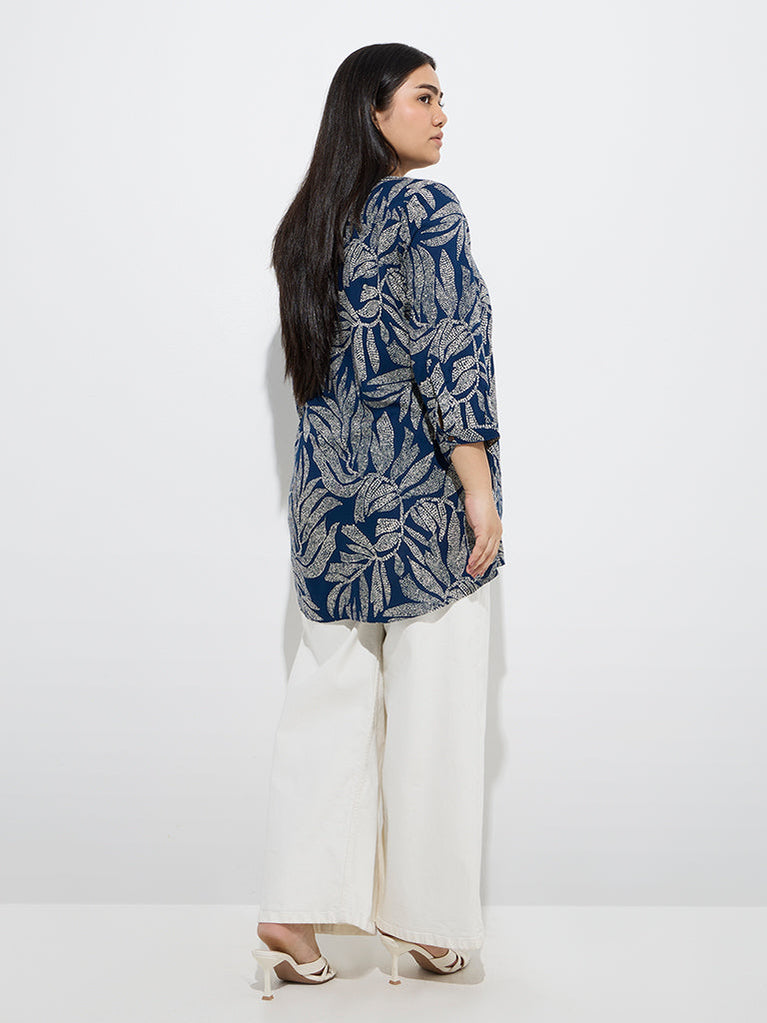 This teal ethnic kurti from Diza highlights foliage prints all over. Featuring a mandarin neck with a brief button placket and three-quarter sleeves, the breathable separate combines classic detailing with versatile style.