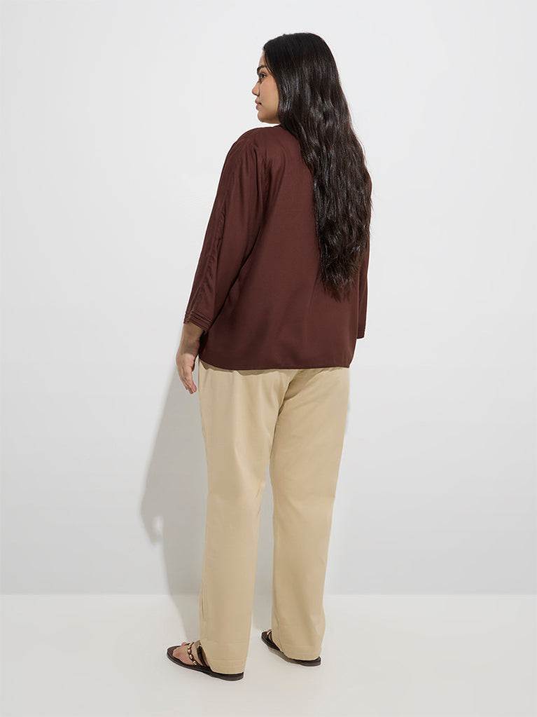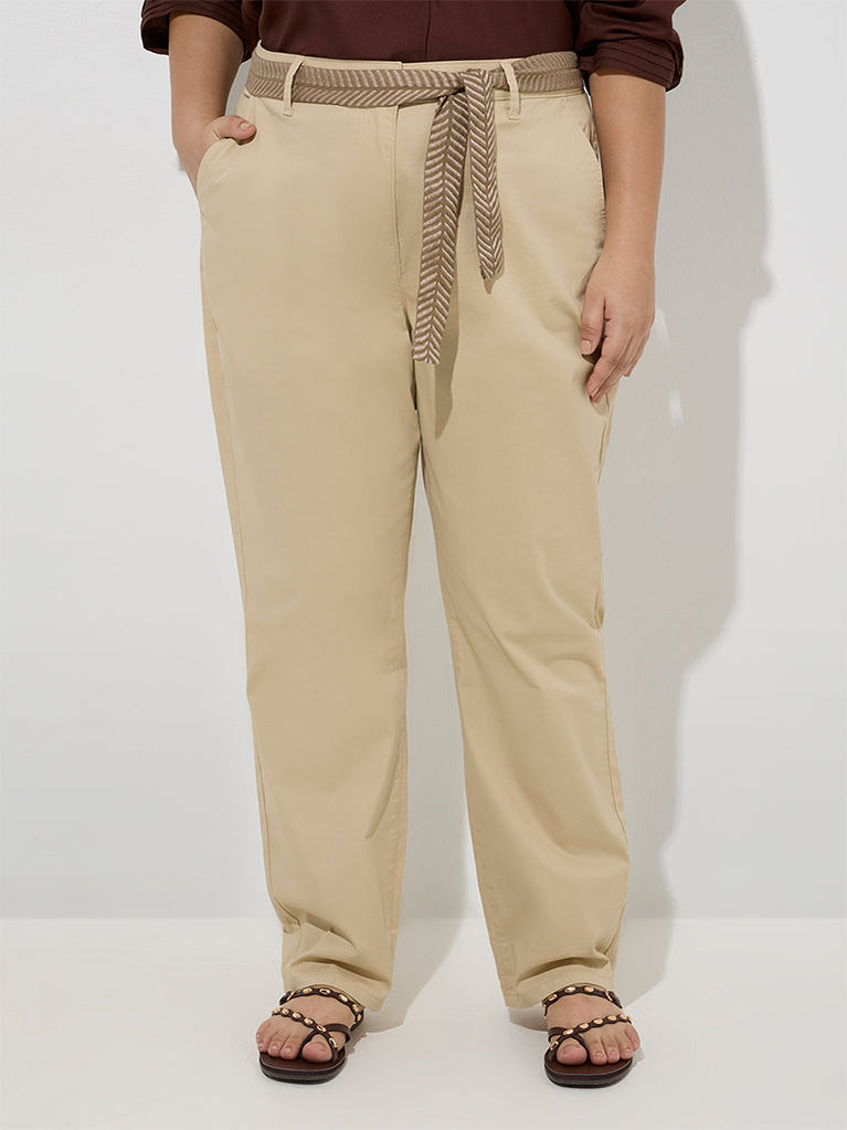 Gia Beige Solid High-Rise Cotton-Blend Pants with Belt
