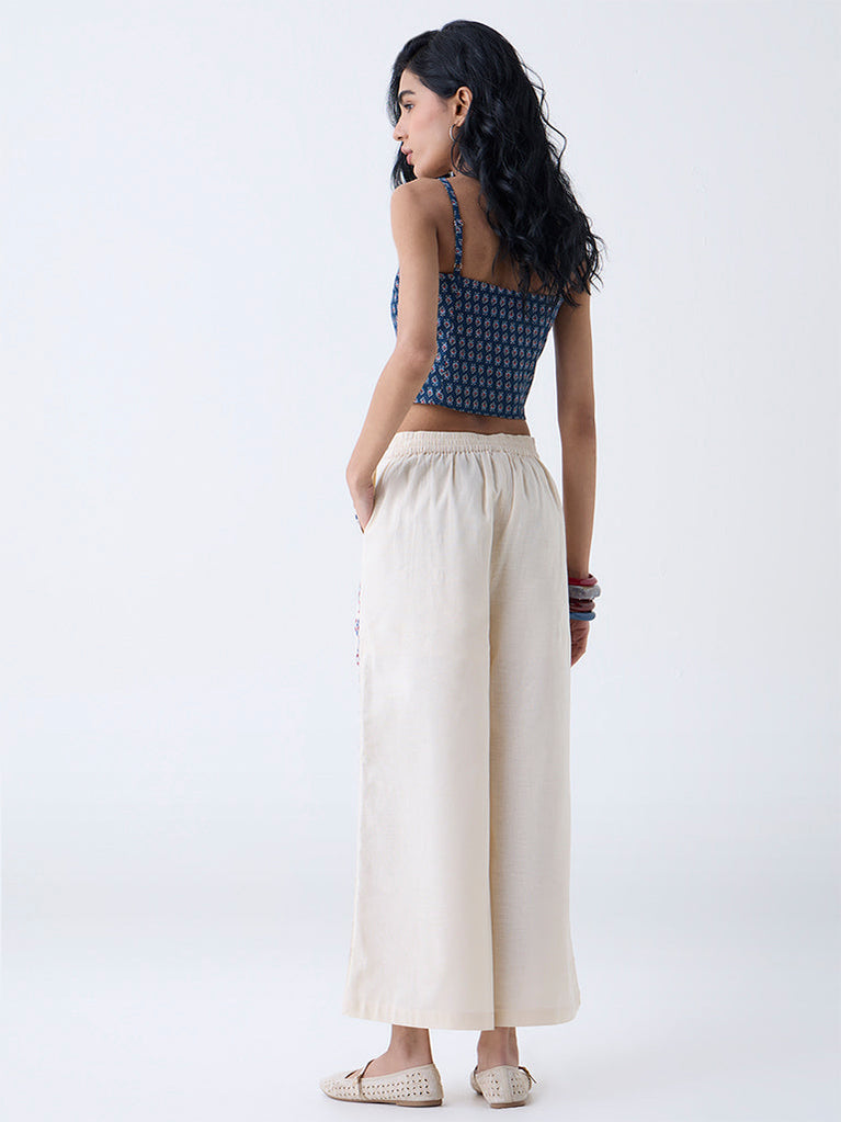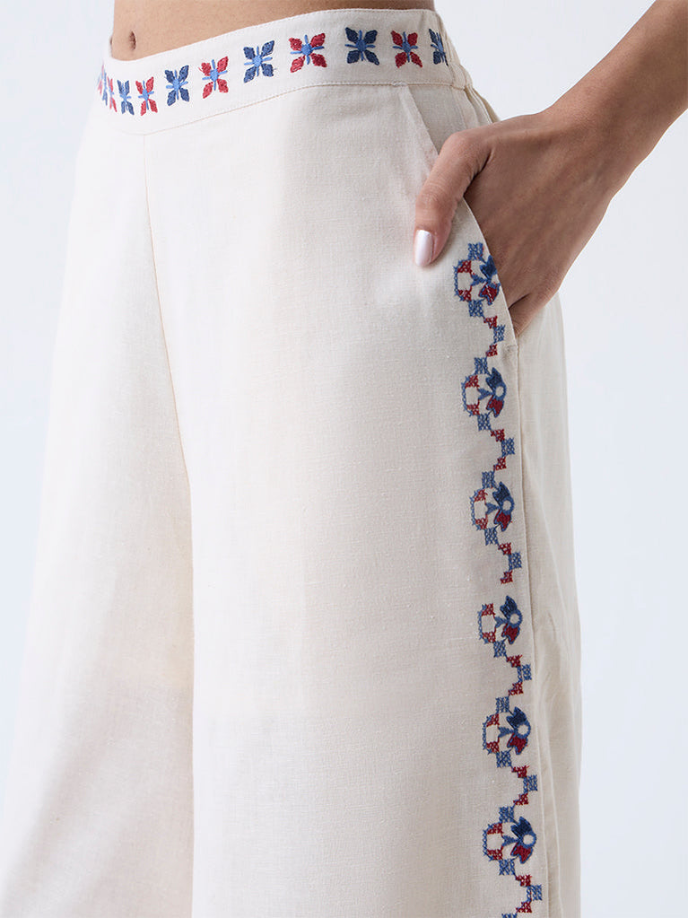 Bombay Paisley Off-White Embroidered Cotton-Blend Palazzos