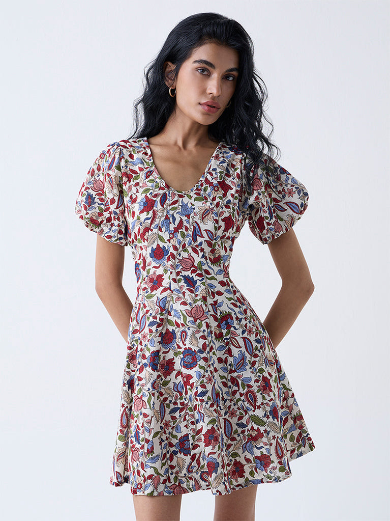 Designed for relaxed daytime plans, this multicolour dress from Bombay Paisley displays rich floral prints across a flattering A-line silhouette. The V-neck and puff sleeves add soft volume, while the cotton-rich fabric ensures comfort through warm-weather days. A dependable choice for casual outings with a contemporary, boho flair.