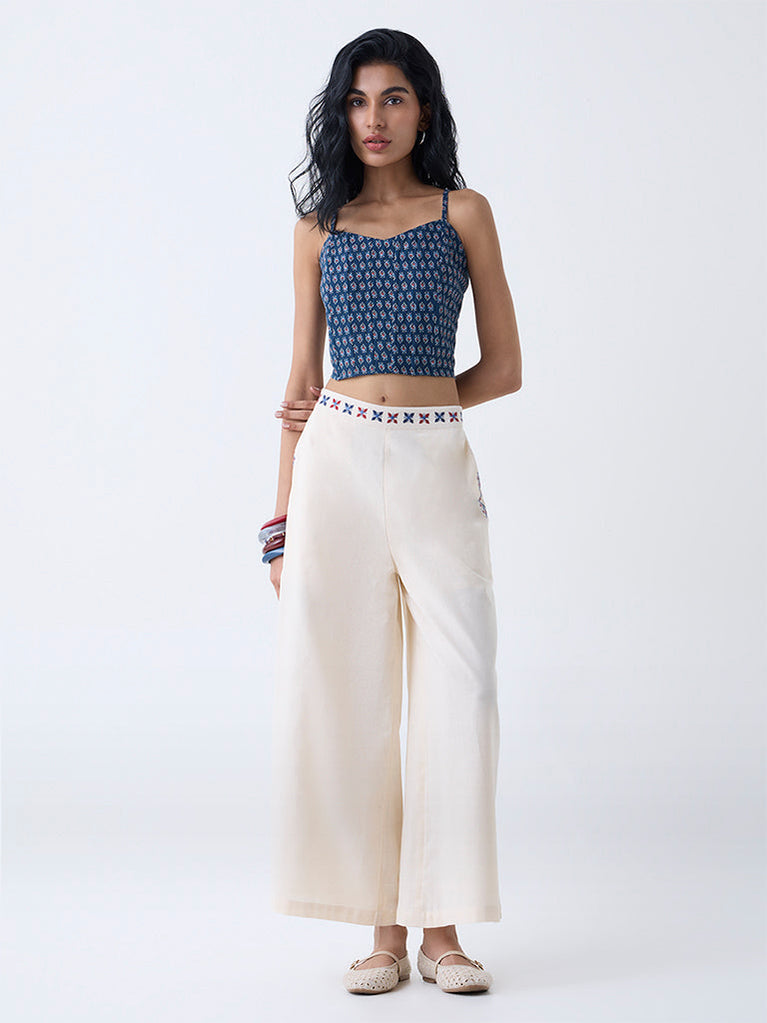 These off-white palazzos from Bombay Paisley make a laid-back addition to warm-weather wardrobes. Cut in a wide-leg silhouette, they’re woven from a soft cotton-blend fabric for breathable comfort. Contrast embroidery along the waistband and side seams adds handcrafted charm and definition. Finished with side pockets, they’re an effortless pick for casual daytime plans.