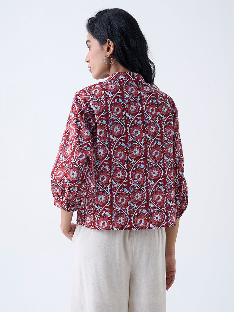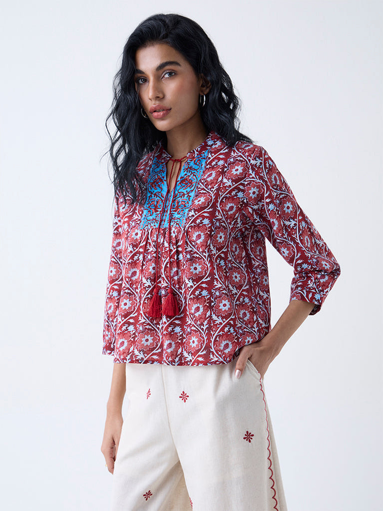 This red top from Bombay Paisley brings an effortless, boho ease to everyday dressing. Its folk-inspired foliage print adds a crafted charm, while the split neckline finished with tasseled tie-up accents introduces a soft point of interest. Blouson sleeves and a relaxed silhouette enhance its fluid shape, and the breathable cotton-rich fabric keeps the piece comfortably wearable through long, unhurried days.