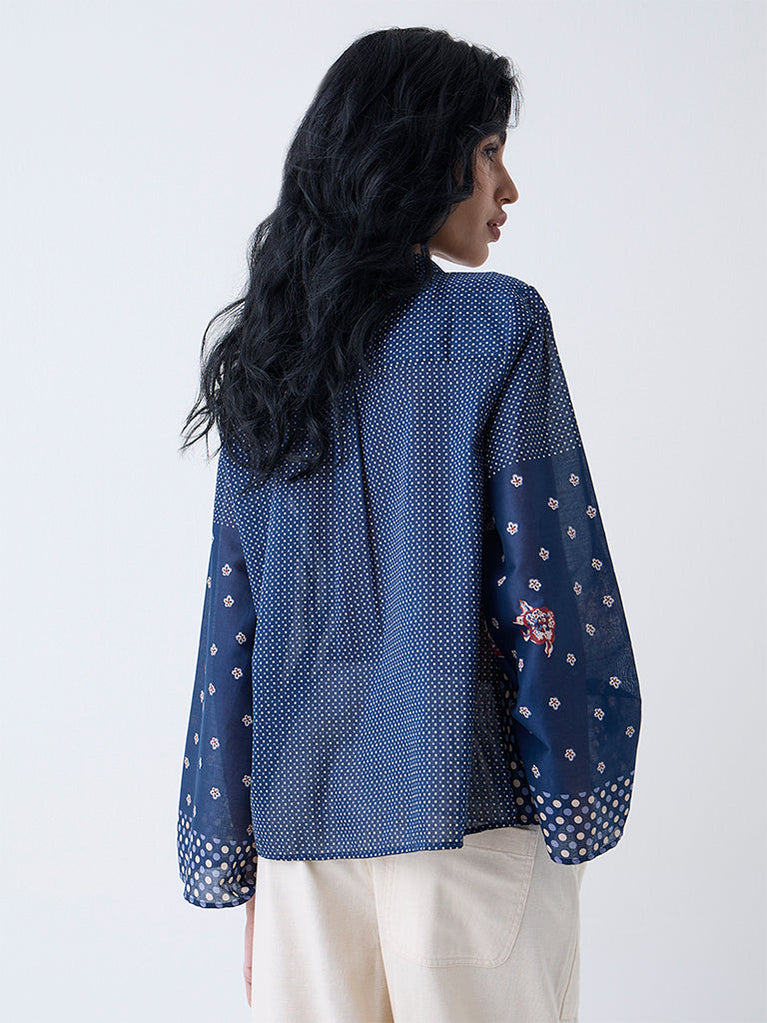 Bombay Paisley reimagines everyday staples with this dark blue Shirt, brought to life through alternating badla-inspired and miniature floral panels. Crafted from a smooth cotton-blend fabric, the silhouette features a classic collar, a button-down front and bell sleeves that create a soft, languid drape. A versatile piece suited to contemporary boho wardrobes.