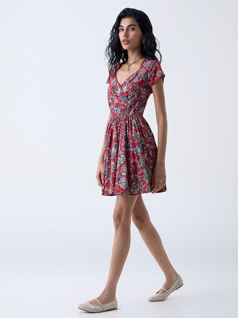 Make a statement with this red dress from Bombay Paisley. Featuring delicate floral prints, it is crafted with soft pleats that lend a flowing, graceful movement. Designed with a pentagon neckline, short sleeves, and handy side pockets, the dress is elevated by a cut-out back with smocked detailing, blending style and comfort for everyday wear.