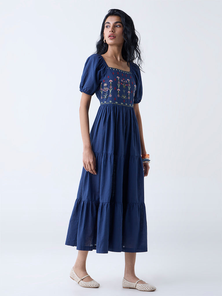This dark blue dress from Bombay Paisley is elevated with vivid floral embroidery across the bodice, lending a handcrafted touch. Woven from breathable cotton, it’s framed with a square neck and puff sleeves, while gathered seams create a tiered, flowing skirt. A smocked back adds gentle stretch, making it a comfortable pick for Sunday plans and leisurely strolls.