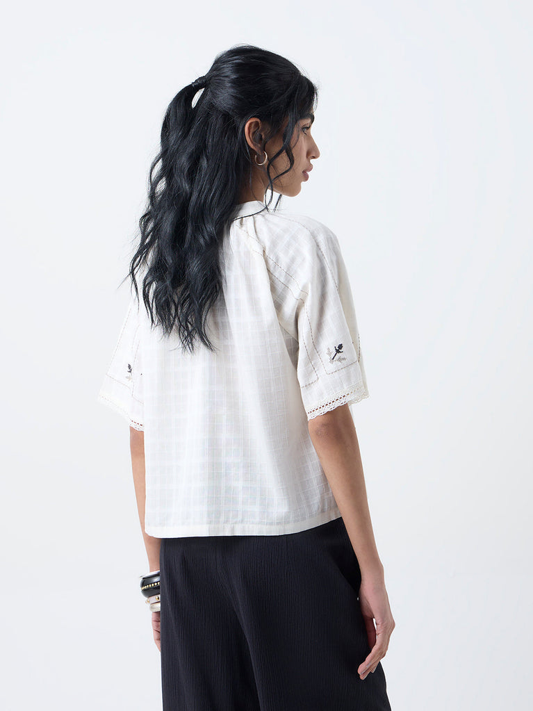Crafted with a keen eye for detail, this off-white shirt from Bombay Paisley showcases cross-stitch floral embroidery that brings a handcrafted, heritage-inspired nuance to the silhouette. Cut from pure cotton for a soft, breathable feel, it features a mandarin neckline flowing into a button placket and relaxed short sleeves.
