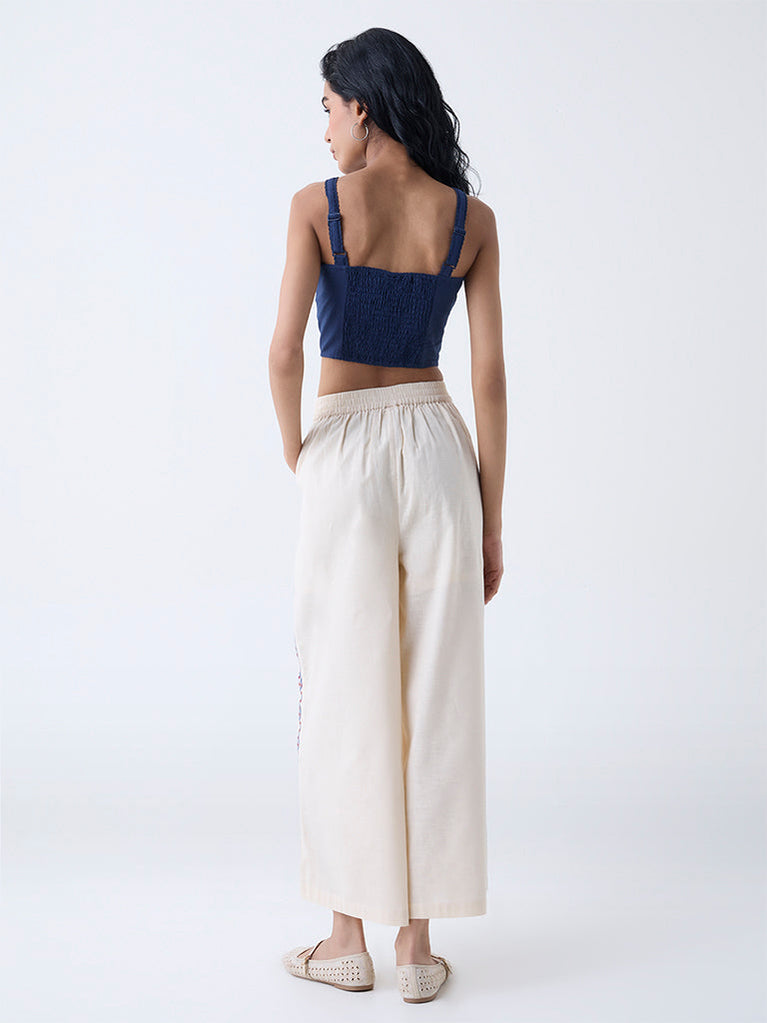 Bombay Paisley elevates everyday dressing with these black crinkle-textured pants, enriched with delicate floral embroidery tracing the hemline. Crafted from pure cotton for breathable ease, they feature a classic button-and-zip closure, belt loops and practical side pockets for day-to-day functionality.
