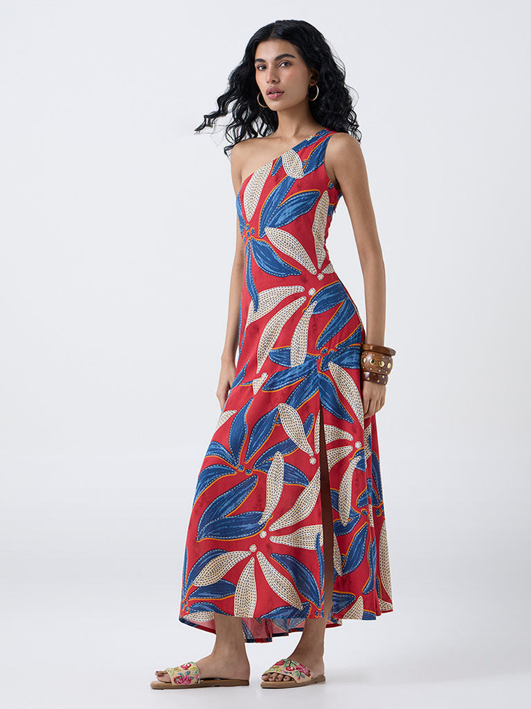 This red dress from Bombay Paisley is adorned with detailed foliage motifs. Spun from a breathable fabric, it offers a light, easy feel for warm days. The A-line silhouette is shaped with a one-shoulder neckline that adds a graceful touch.