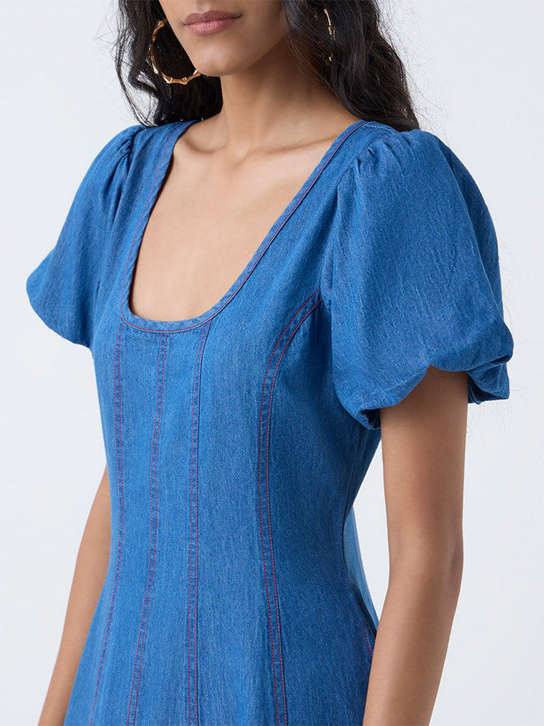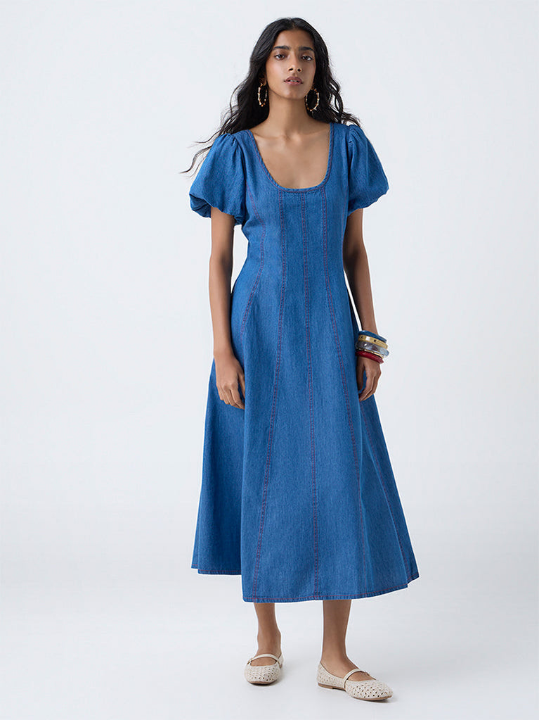 Make a chic statement with this blue denim dress from Bombay Paisley defined by embroidered stripes along a graceful A-line silhouette. It is tailored from pure cotton fabric that ensures all-day comfort. Finished with a scoop neck, puff sleeves and a back zipper, this design offers a poised yet easygoing look for everyday occasions.
