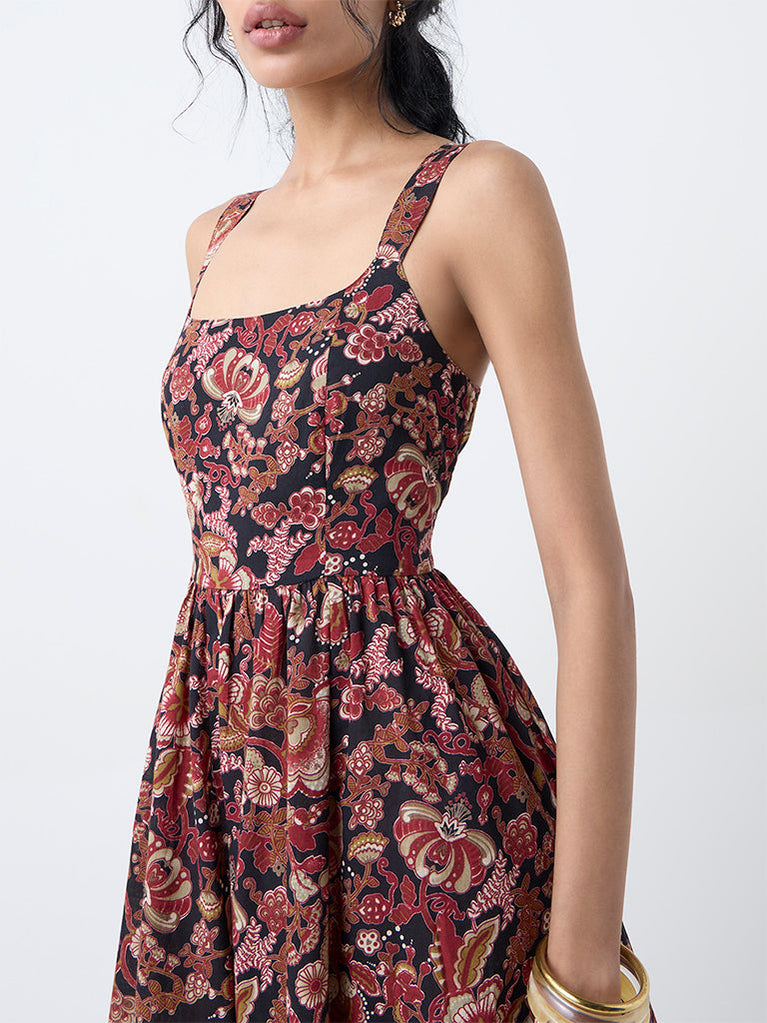Bombay Paisley Maroon Floral Cotton A-Line Dress