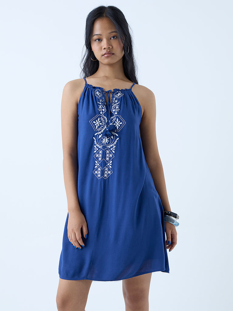 Bombay Paisley Indigo Embroidered Cotton A-Line Dress