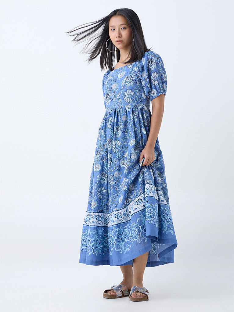 Bombay Paisley Blue Floral Design Cotton Drop-Waist Dress
