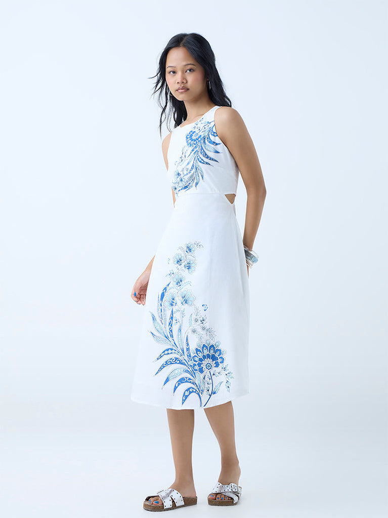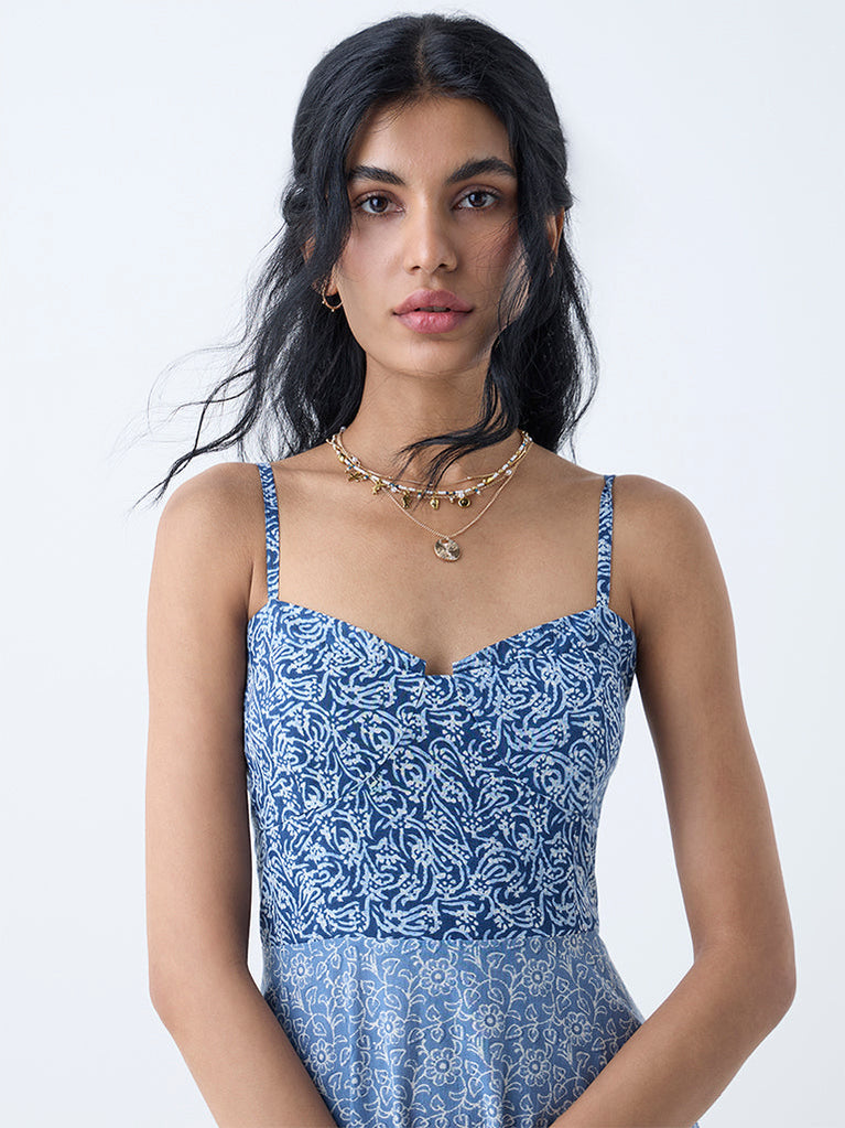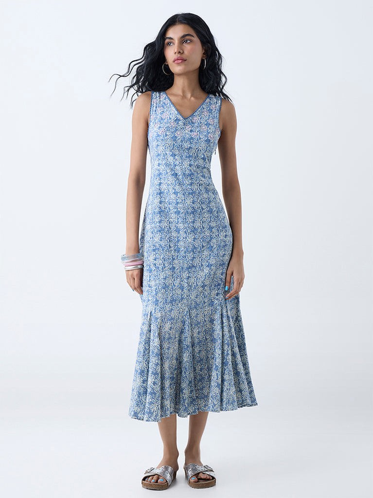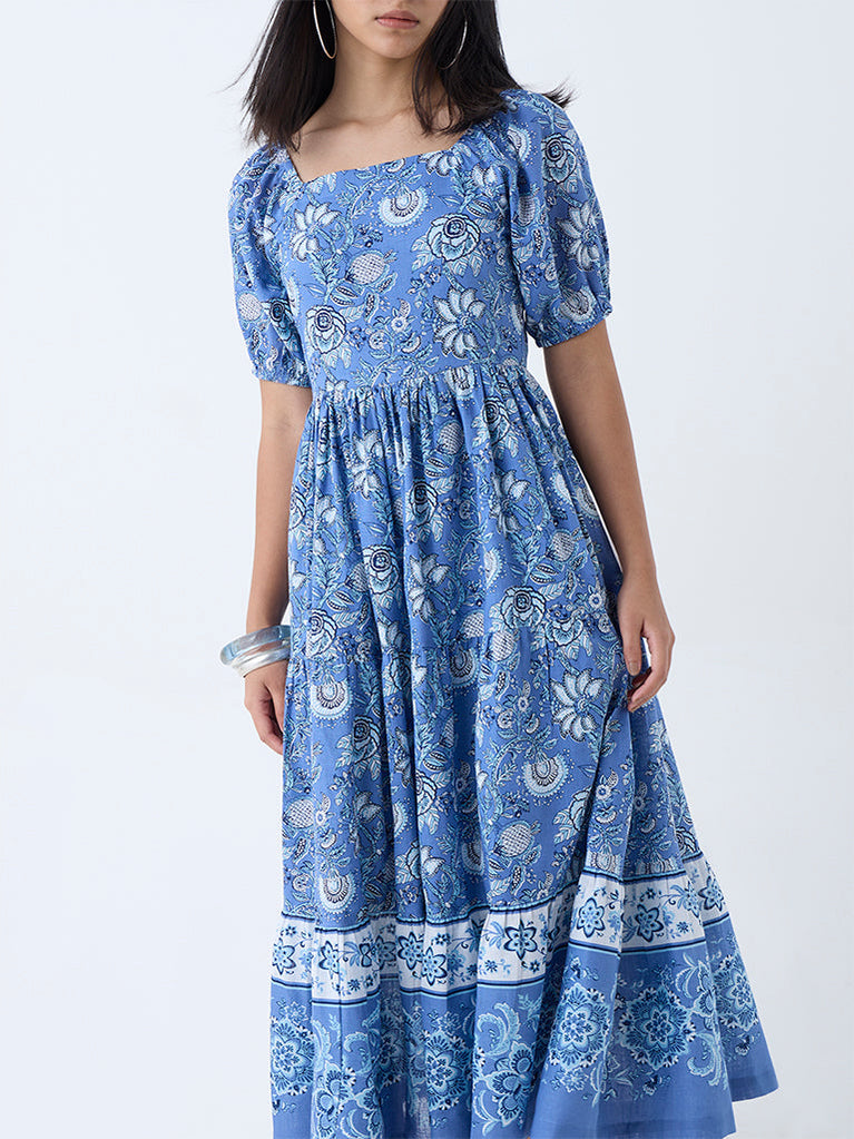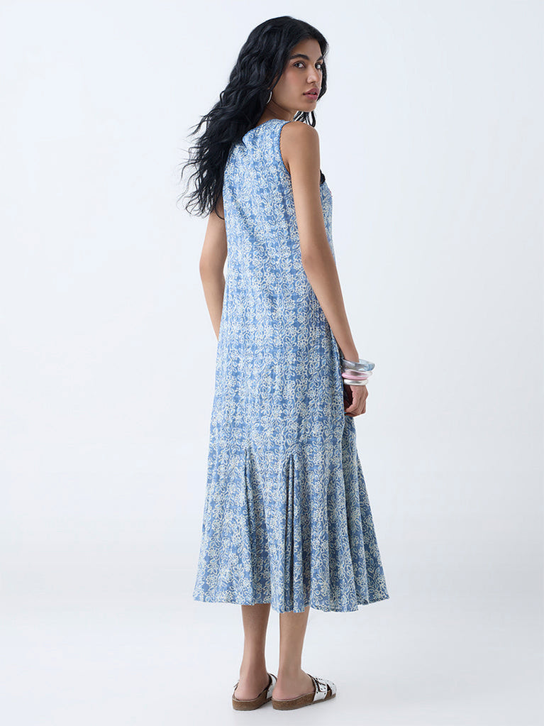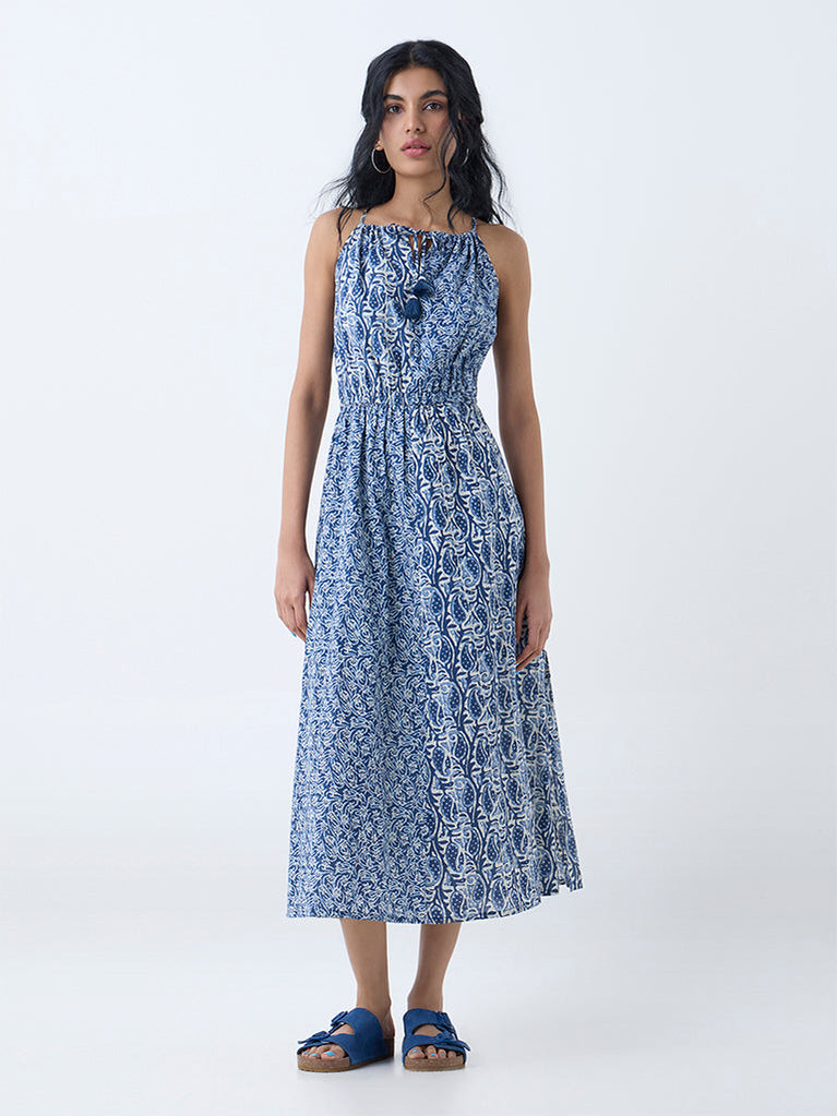 Bombay Paisley Blue Floral Detailed Cotton A-Line Dress