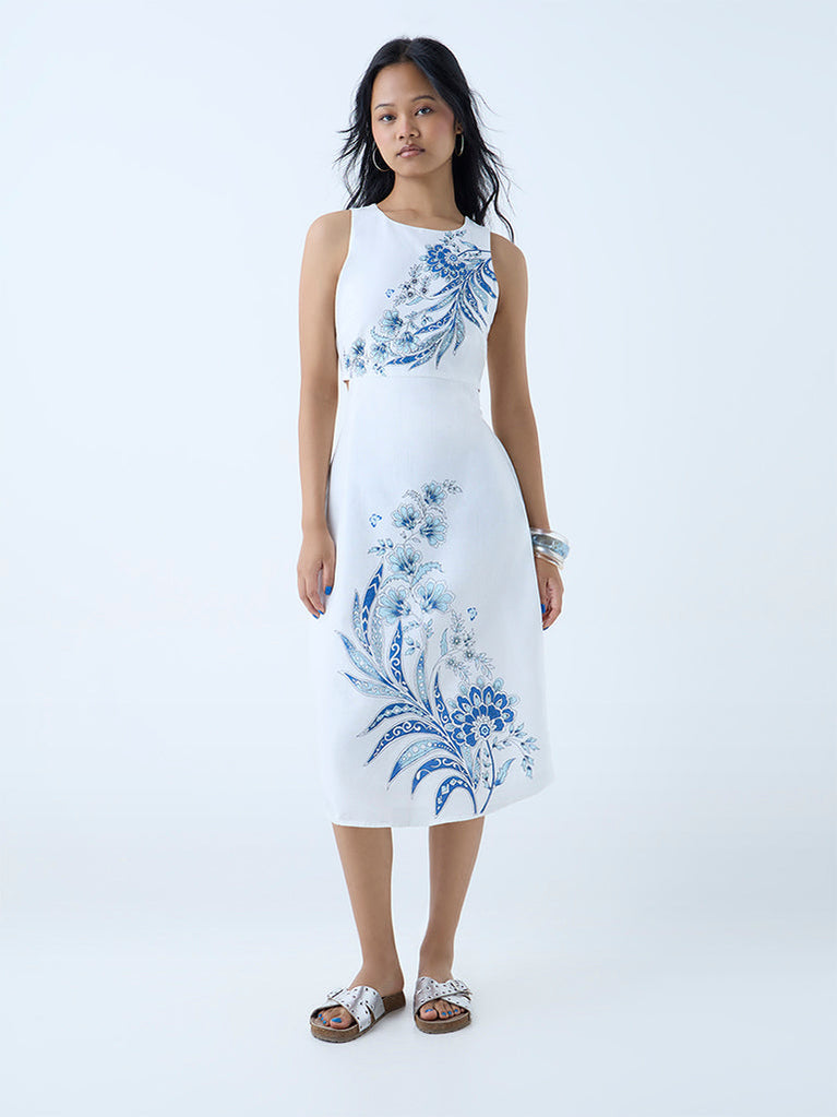 This white sheath dress from Bombay Paisley blooms with vibrant floral prints. Spun from a soft cotton-blend fabric, the fitted silhouette is styled with a round neck and further accentuated with cut-out detailing at the waist for a stylish look.