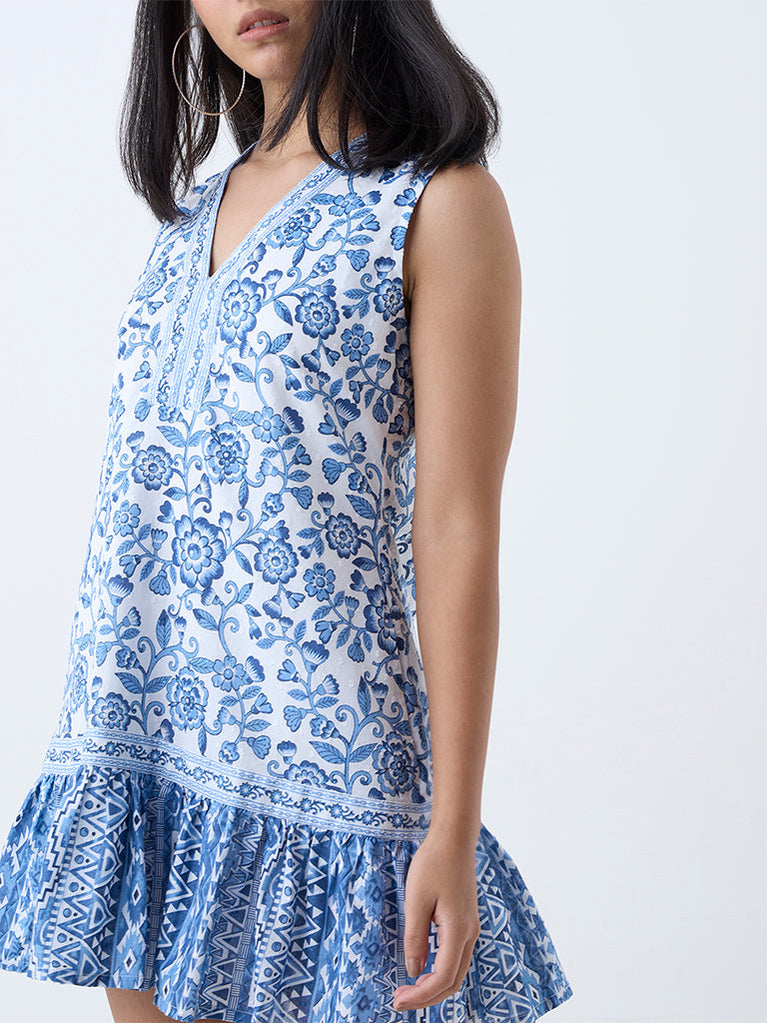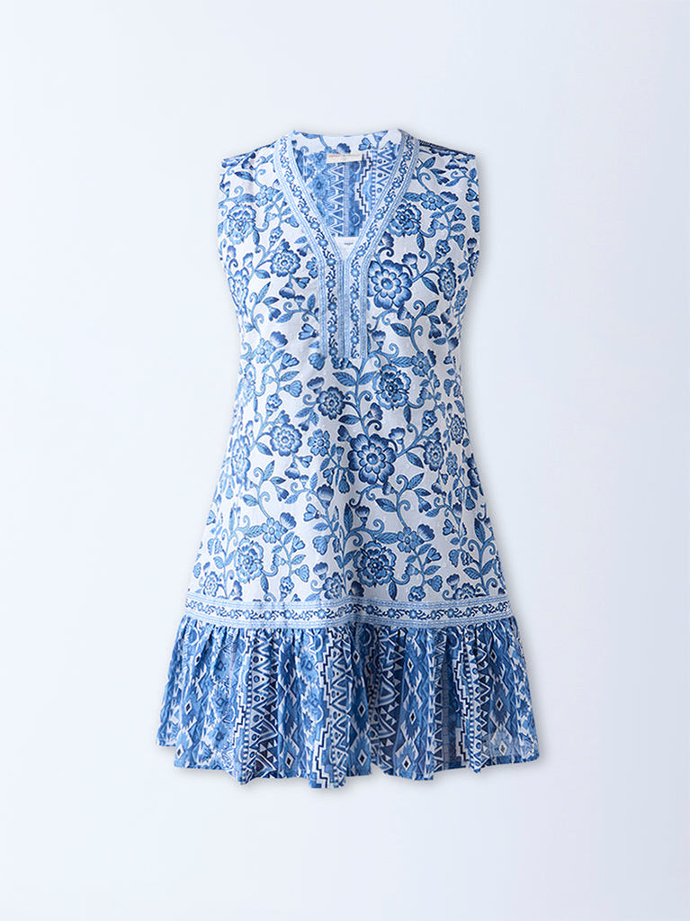 Step into sophisticated ease with this blue dress by Bombay Paisley. Tailored from pure cotton, it showcases beautiful floral motifs on a flowing A-line silhouette. The sleeveless cut is balanced by a V-neckline, while ruffle detailing at the hem adds a feminine finish.