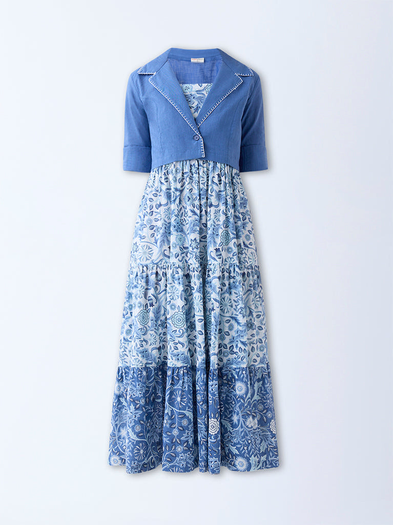 Bombay Paisley Blue Floral Cotton Tiered Dress with Jacket