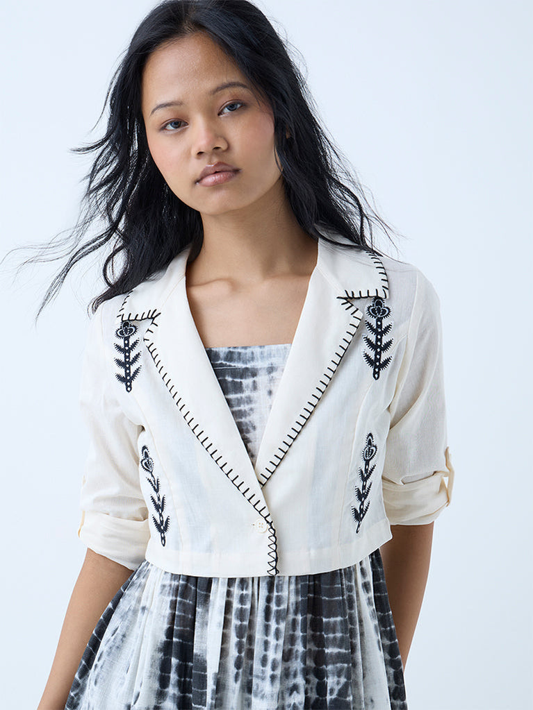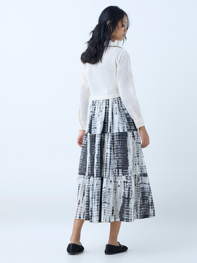 Bombay Paisley introduces this dark grey dress, reimagined in a tie-dye profile for a striking yet grounded aesthetic. Milled from pure cotton in a flowy tiered silhouette, it features a square neck with adjustable straps and a smocked back for ease and movement. The set is elevated with a matching jacket, adorned with floral embroidery, a notched lapel, and full sleeves.