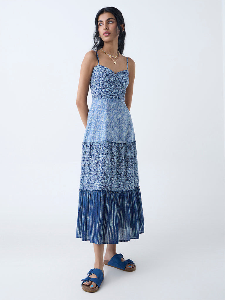 Bombay Paisley Dark Blue Printed Cotton Tiered Dress