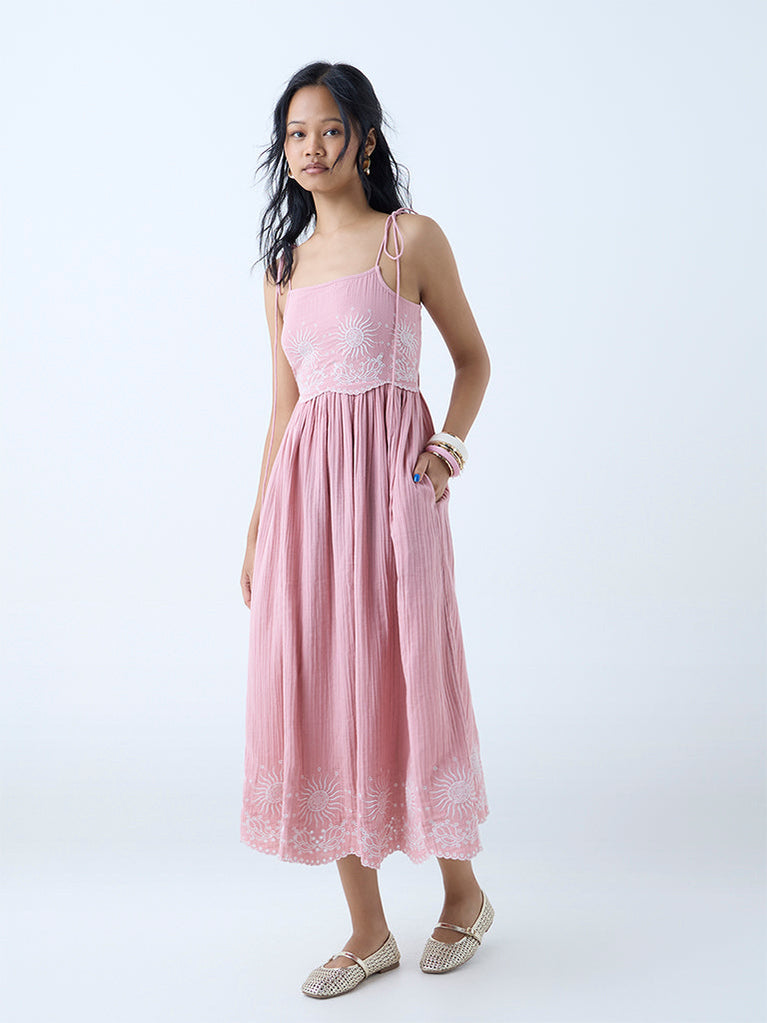This pink dress from Bombay Paisley brings together breezy comfort and delicate detailing. Milled from pure cotton in a flattering A-line silhouette, it’s elevated with intricate embroidery and scalloped edges along the bodice and hem. The tie-up shoulder straps lend a playful finish, while the smocked back ensures a snug fit.