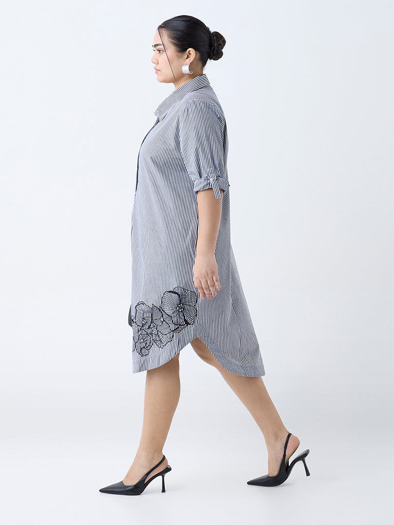 Reworking a classic with feminine charm, this black tunic dress from Gia is detailed with crisp stripes and delicate floral lace near the hem. Constructed from pure cotton for breathable comfort, it features a sharp collar with a concealed button placket, upturned three-quarter sleeves and side pockets that marry polish with practicality.