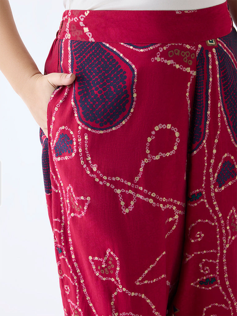 The perfect mix of modern vibe with traditional details, these red ethnic pants from Diza features bandhani-inspired floral designs for added elegance while the elasticated waist ensures a comfortable fit.