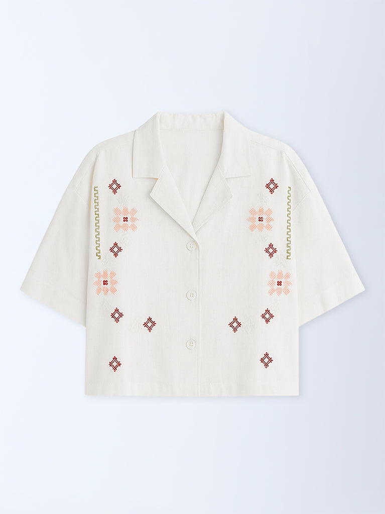 Let your style reach new heights with this off-white shirt from Bombay Paisley. Spun from a cotton-rich fabric, it spotlights cross-stitched embroidery for subtle detailing. A notched lapel collar flows into a button-up front, while short sleeves keep the silhouette fresh and easy-going.
