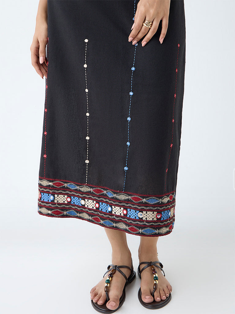 This black dress from Bombay Paisley blends boho-inspired charm with modern elegance. Showcasing intricate embroidery on a flattering A-line silhouette, this pure-cotton separate is styled with a square neck and a side zipper closure for easy wear.