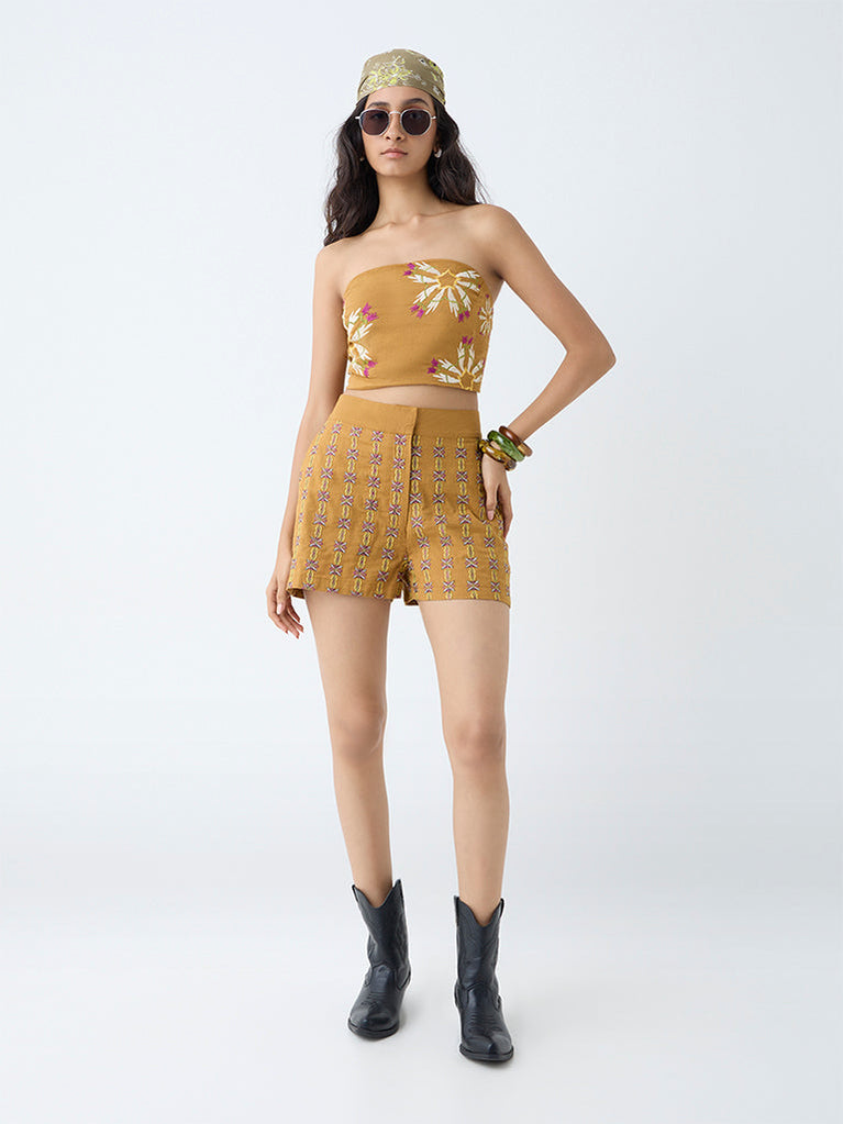 Bombay Paisley Mustard Embroidered Cotton-Blend Shorts