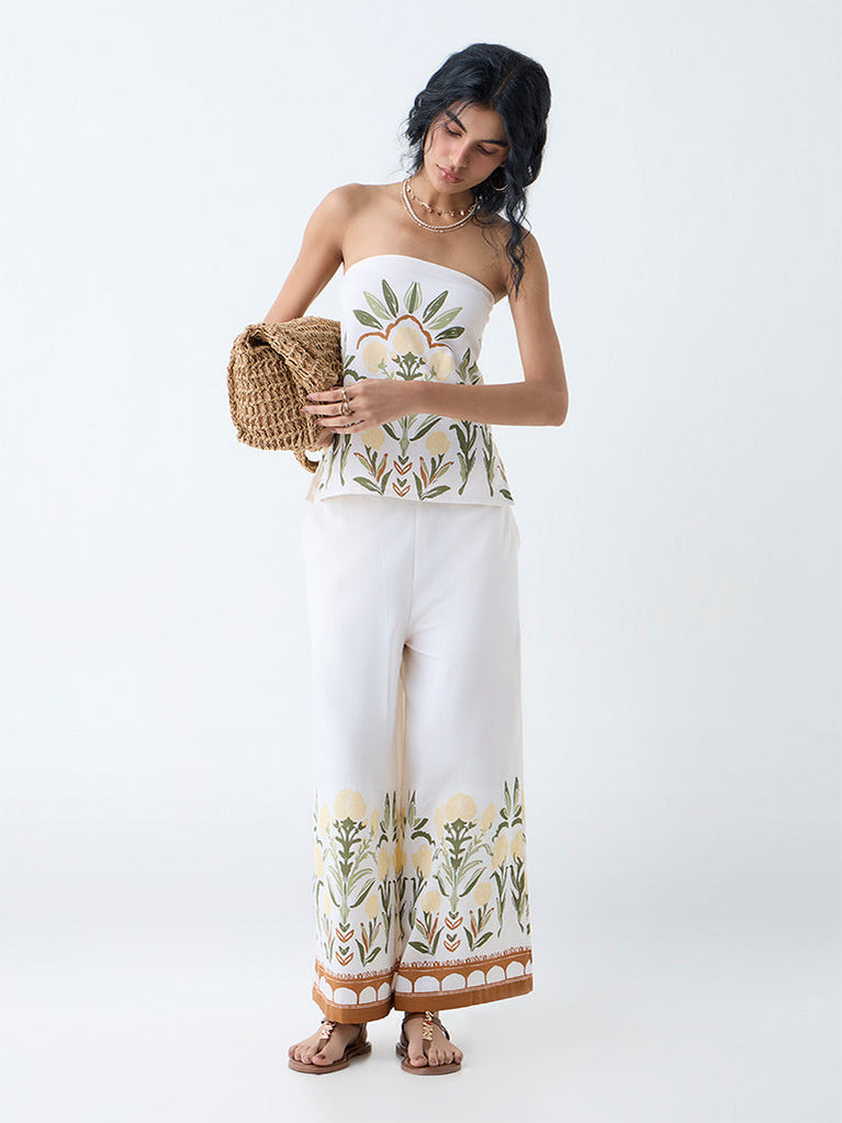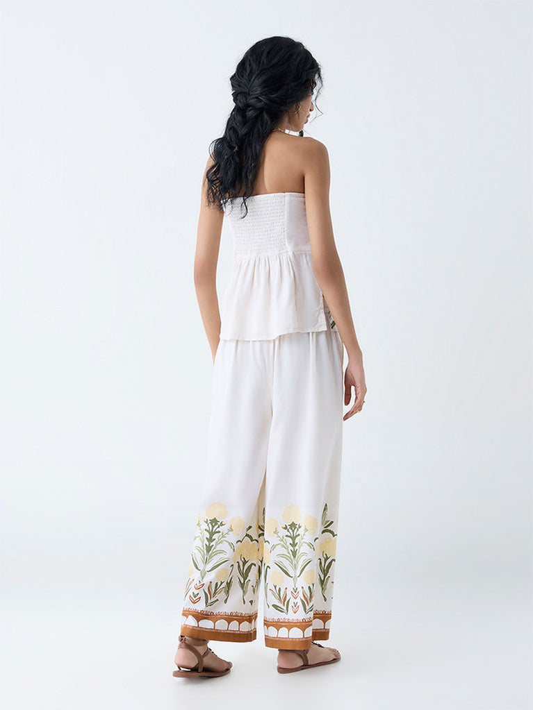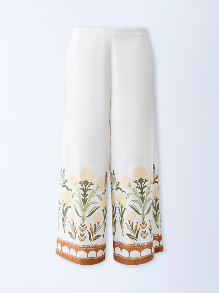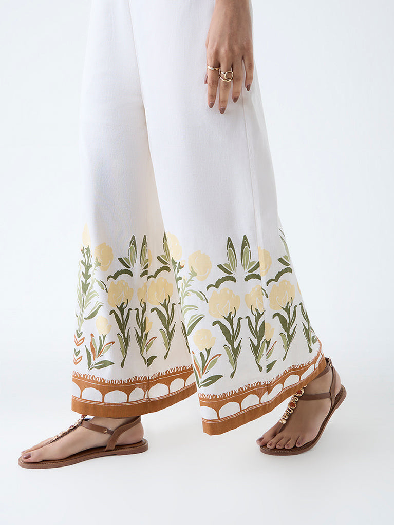 Bombay Paisley White Foliage Print Cotton-Blend Palazzos