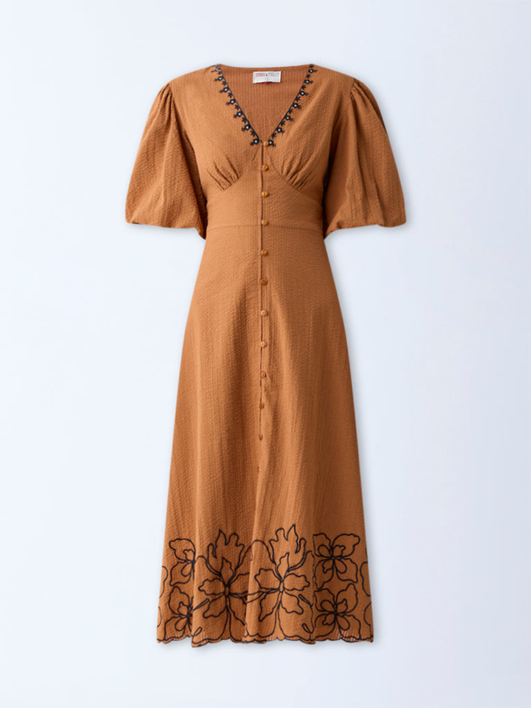 This tan dress from Bombay Paisley is fashioned for looks that can serve you from brunch to evenings out. Spun from a seersucker-textured fabric, it showcases floral embroidery near the hem, while the V-neck and balloon sleeves offer a flattering finish.