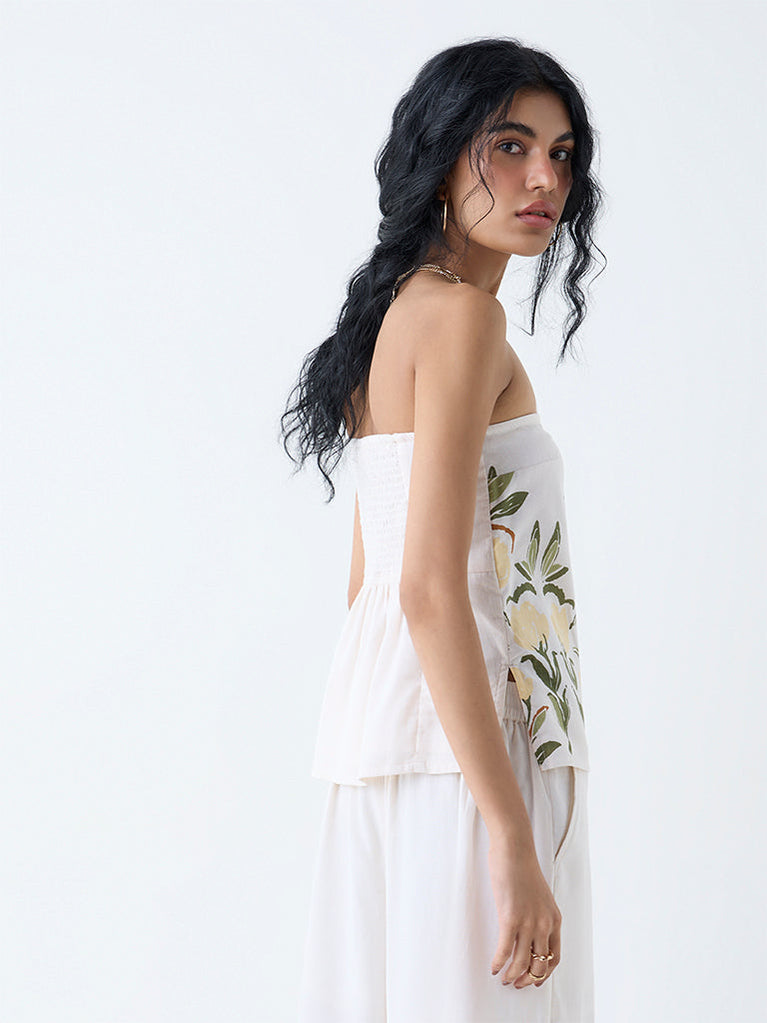 Bombay Paisley White Foliage Print Cotton-Blend Tube Top
