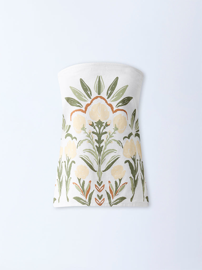 This white tube top from Bombay Paisley is adorned with a lively foliage print. Spun from pure cotton for all-day comfort, it features a smocked back that ensures a flattering fit, making it an easy pick for carefree days out.