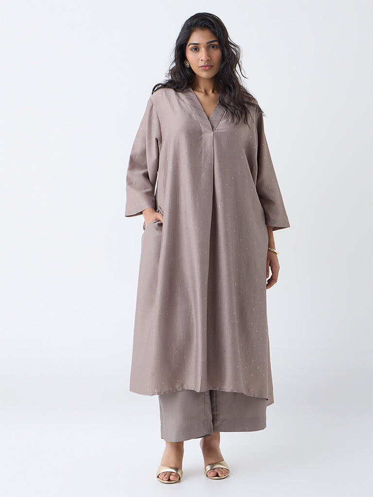 Bring a touch of festive luxury to your wardrobe with this taupe kurta from Diza. Detailed with gold-toned embellishments for a hint of radiance, it’s shaped in a flattering A-line silhouette with a V-neckline, three-quarter sleeves, and side pockets for everyday practicality.