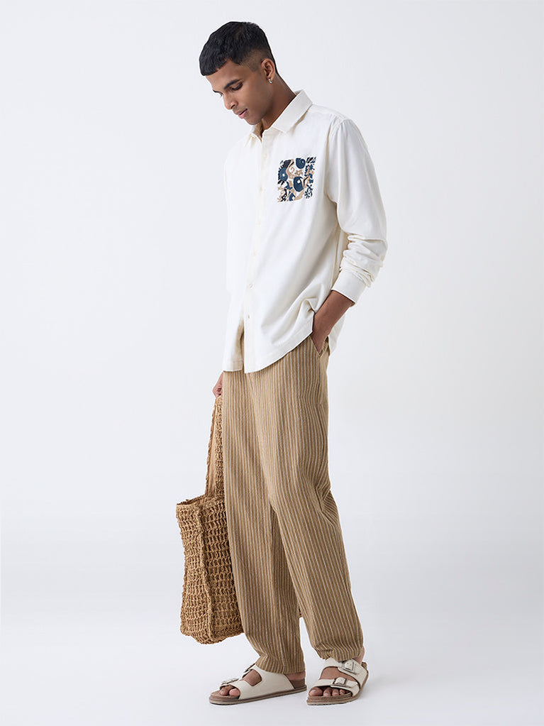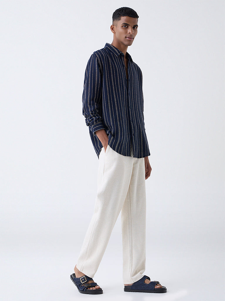 ETA introduces a clean, versatile essential with this off-white shirt, defined by embroidered stripes that add quiet structure to the relaxed silhouette. Cut from a breathable woven fabric, it keeps you comfortable from morning commutes to evening downtime. Finished with a classic collar, full sleeves and a buttoned front, it adapts easily to smart-casual plans or polished weekend dressing.